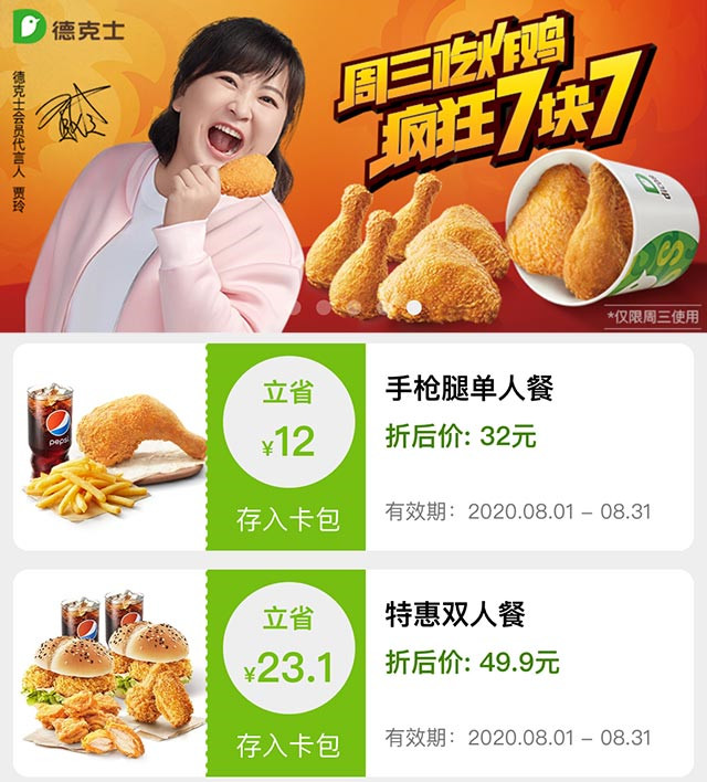 德克士套餐优惠券2020年7月单人套餐28元起,双人套餐49.9元起