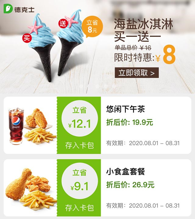 德克士2020年8月套餐优惠券领取,单人餐26元起 双人餐49.9元