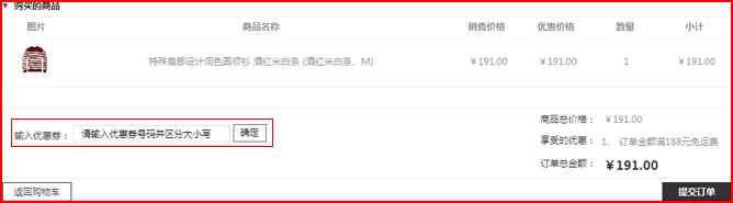 4.在提示填入优惠券号码的框内,粘贴优惠券号码。