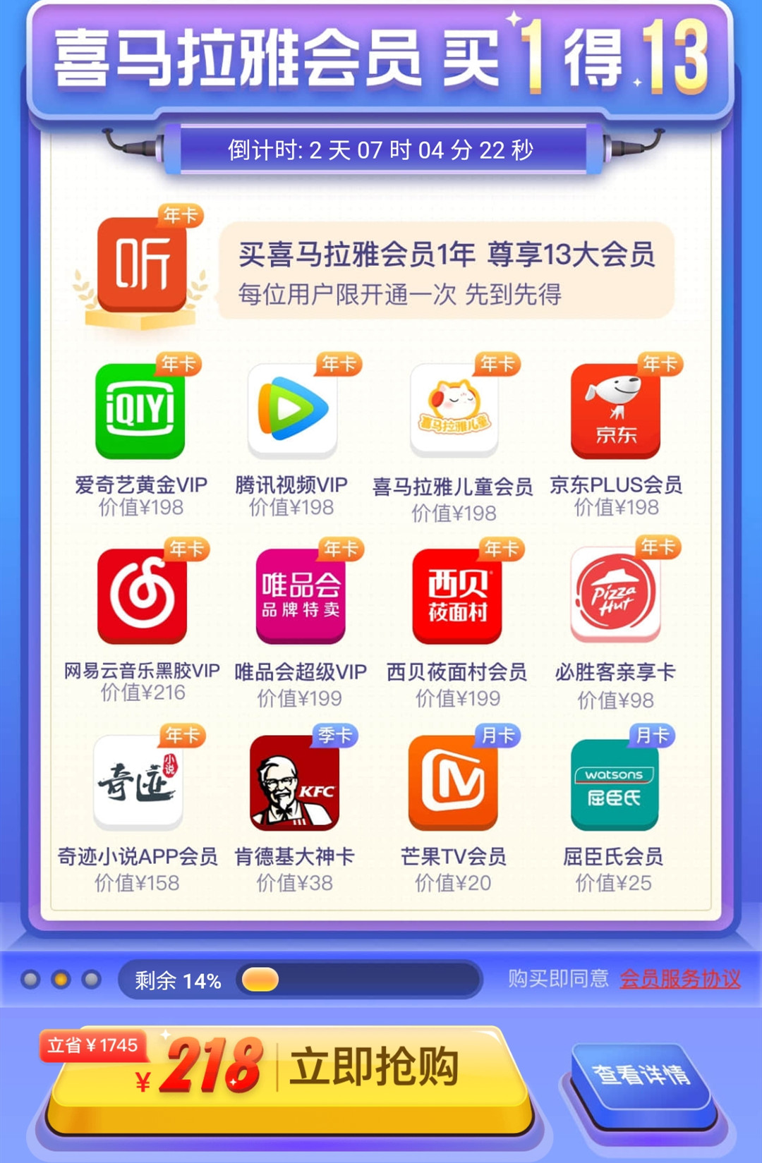 喜马拉雅买1得13活动!集齐所有视频会员!!!只要218元=13大会员权益。8月15日16:00-8月19日,可能提前结束,每个用户限购一次。除喜马拉雅年度会员权益外,可享受联合会员权益如下:-爱奇艺黄金vip、腾讯视频vip、京东plus会员、网易云音乐黑胶vip、唯品会会员各一年,以及芒果tv会员一个月-喜马拉雅儿童会员、奇迹小说app会员各一年-西贝莜面村会员、必胜客亲享卡各一年,肯德基大神卡三个月、屈臣氏会员一个月