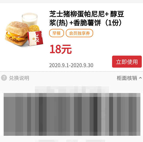 早餐 芝士猪柳蛋帕尼尼+醇豆浆(热)+香脆薯饼1份 2020年9月凭肯德基优惠券18元
