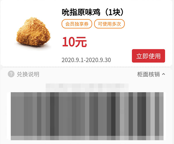 吮指原味鸡1块 2020年9月凭肯德基优惠券10元