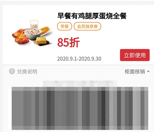 早餐 有鸡腿厚蛋烧全餐 2020年9月凭肯德基优惠券85折