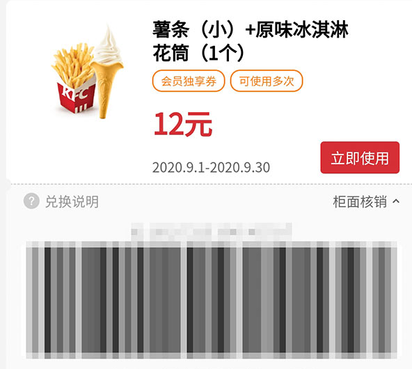 薯条(小)+原味冰淇淋花筒1个 2020年9月凭肯德基优惠券12元