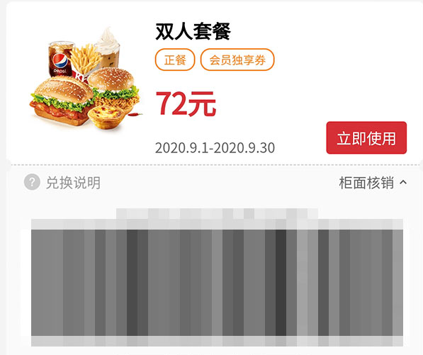 堡堡2人套餐 烤堡+辣堡+蛋挞+薯条+雪顶咖啡+百事可乐 2020年9月凭肯德基优惠券72元