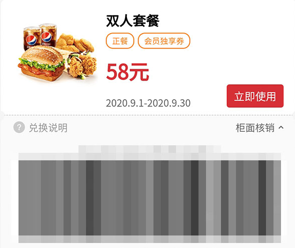 卷堡2人套餐 老北京鸡肉卷+新奥尔良烤鸡腿堡+黄金鸡块+百事可乐(中)2杯 2020年9月凭肯德基优惠券58元
