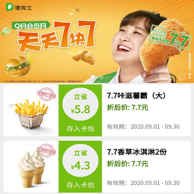 德克士2020年9月每日优惠券领取,7.7元、17.7元、27.7元超值优惠