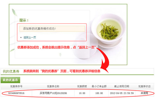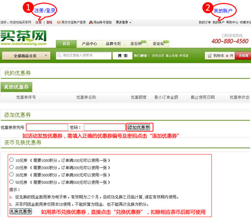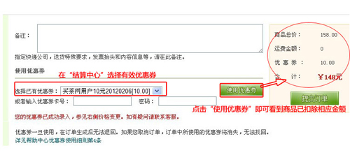 二、买茶网现金抵用券的使用A:现金抵用券可以抵用买茶网的所有消费,包括产品和运费。B:每张现金抵用券的使用额度以不高于订单总额的10%.即:订单满100元方可使用一张10元的现金抵用券;订单满200元方可使用一张20元的现金抵用券;订单满300元方可使用一张30元的现金抵用券;订单满500元方可使用一张50元的现金抵用券;订单满1000元方可使用一张100元的现金抵用券;C:现金抵用券和积分使用和其他促销活动不能同时享受;D:每个订单每次只能使用一张现金抵用券;多个订单合并后也只能使用一张现金抵用券,否则无法合并,每张现金抵用券只能使用一次,不可多次使用;E:现金抵用券必须在有效期以内使用,过期无效;F:现金抵用券部分不在开具发票金额之内,发票金额以您实际支付的金额为准;G:本站先付款普通快递满200元包邮,顺丰\EMS\宅急送快递满300元包邮需要减去优惠券部分后满足要求才可以免邮。 更多买茶网优惠券: