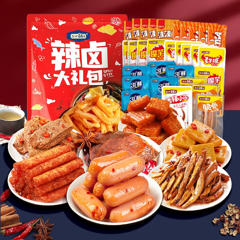 盐津铺子 零食大礼包海味肉类辣卤类零食小吃 办公休闲食品麻辣条鱼豆腐豆干礼包 礼盒 辣味肉肉礼包约30包1148件已付款抢! -