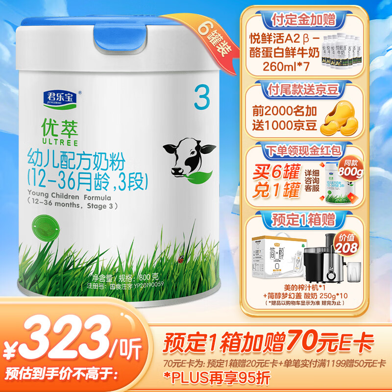 君乐宝(JUNLEBAO)有机优萃3段幼儿配方奶粉(12-36月龄)800g*6听装 有机生牛乳+小分子蛋白+双重益生菌9324件已付款抢! -