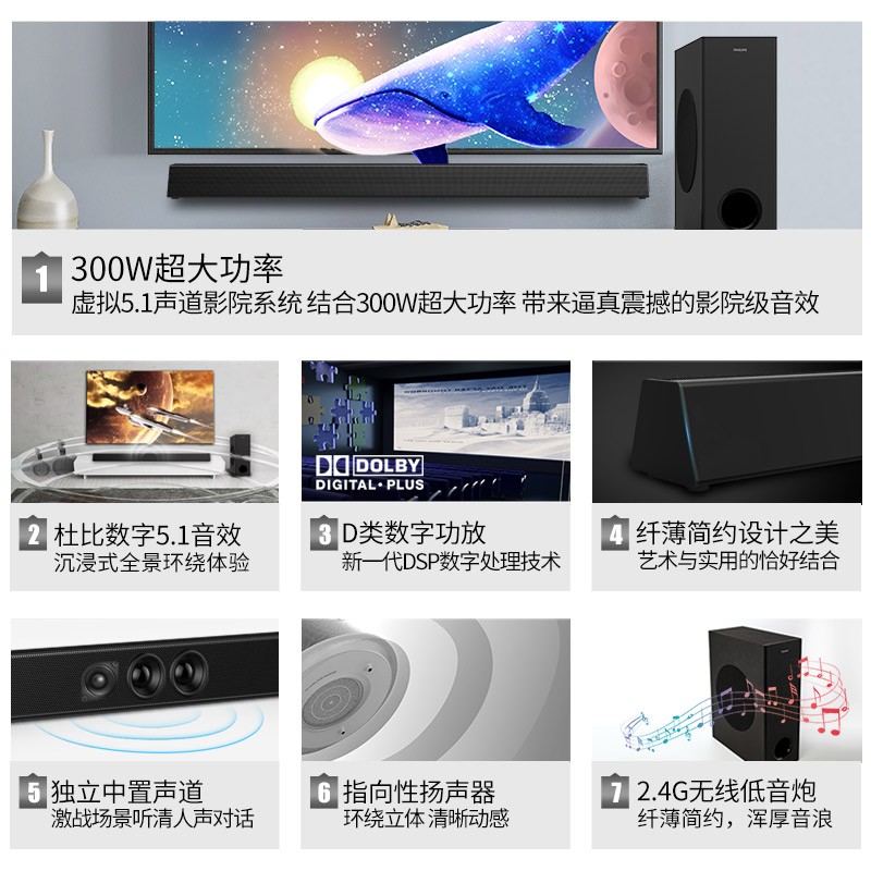 飞利浦(PHILIPS)HTL3320 回音壁 电视音响 杜比5.1家庭影院 300W功率蓝牙音箱 无线低音炮套装6300件已付款抢! -