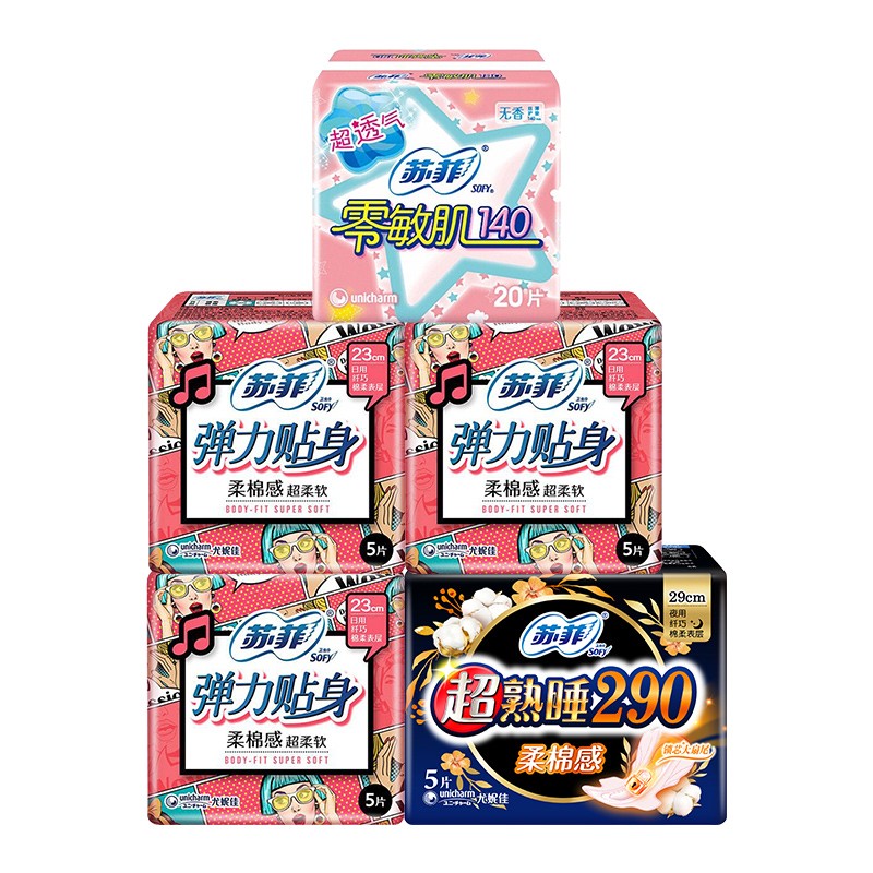 Sofy 苏菲 卫生巾组合 69片 ( 超熟睡420mm*4+超熱睡290mm*20+弹力贴身230mm*15+零敏肌140mm*20+极薄230mm*8)35.9元2469件已付款抢! -