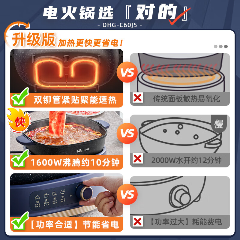 小熊(Bear)电火锅 电炒锅 电煮锅 电锅分体 电热锅 多功能锅多用途家用涮火锅专用锅具6L DHG-C60J5 火锅锅2060件已付款抢! -