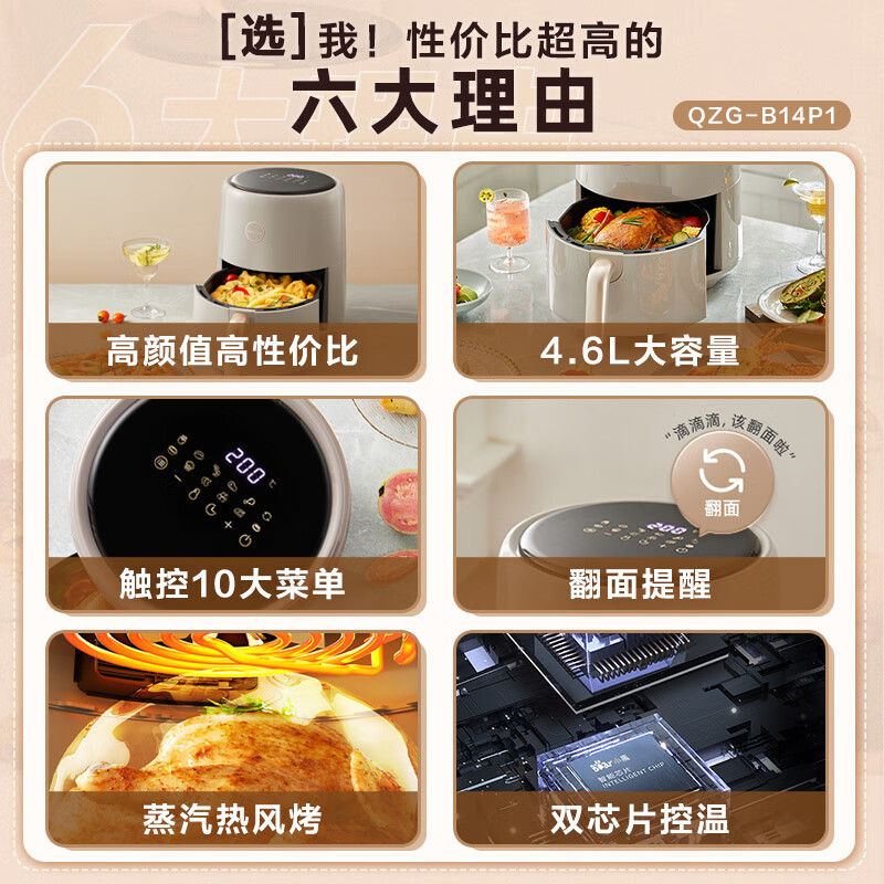 小熊(Bear)空气炸锅 家用多功能 4.6L大容量 无油低脂烤箱触控智能预约微蒸汽嫩烤 薯条电炸锅QZG-B14P12324件已付款抢! -