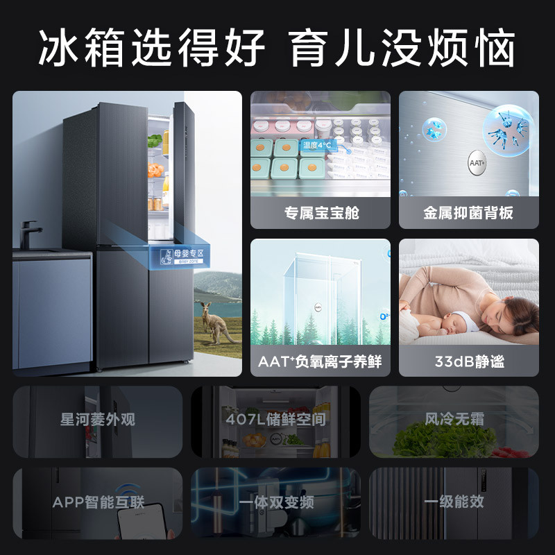TCL 407升T7袋鼠宝宝母婴分区冰箱4度宝宝舱一级能效风冷无霜京东小家十字对开双开四开门超薄电冰箱R407T7-U6819件已付款抢! -