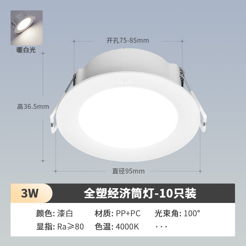 雷士照明(NVC) led筒灯 天花板嵌入式装饰灯 天花灯筒灯孔灯led 牛眼灯洞灯 客厅过道灯 【福利10只装】3瓦 漆白暖白光开孔75-85MM1075件已付款抢! -