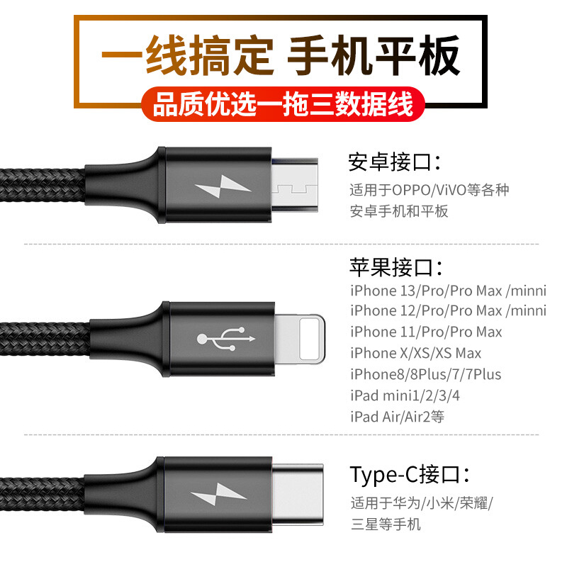 倍思 数据线三合一苹果/Type-c/安卓手机充电器线 适用于iPhone14/13/12ProMax/XR/8小米华为电源线1.2米黑3210件已付款抢! -