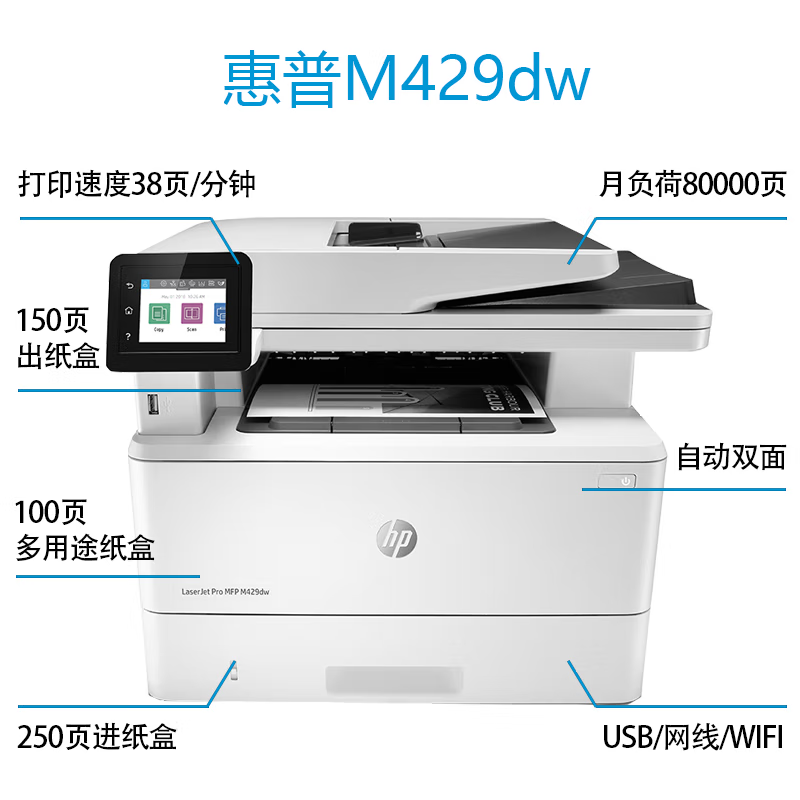 惠普(HP) 429fdw/329dw/431f打印机A4黑白激光复印扫描多功能一体机 双打批量复扫 429dw(有线无线+三合一+双打 +38页/分)1407件已付款抢! -