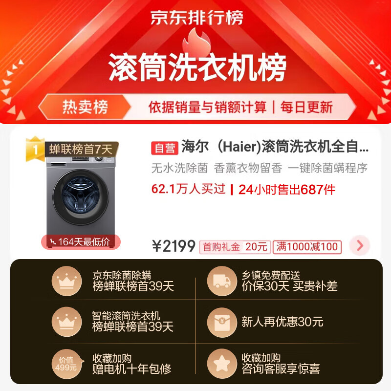 海尔(Haier)滚筒洗衣机全自动10公斤BLDC变频家用节能升级版健康香薰高温除菌除螨MATE3S1584件已付款抢! -