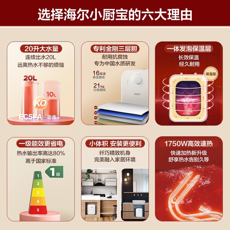 海尔(Haier)小厨宝速热一级能效家用恒温节能厨房小型电热水器储水式上出水FA 5升3716件已付款抢! -