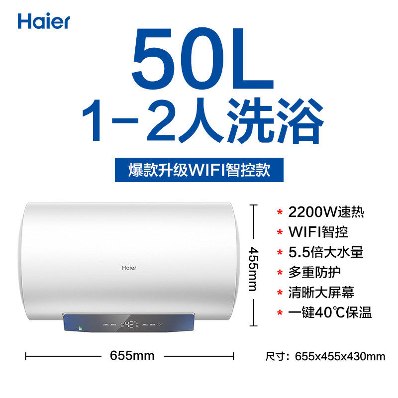 海尔(Haier)电热水器家用储水式一级能效恒温省电APP智能速热上门安装卫生间预约洗澡机MC3 50升【1-2人】9722件已付款抢! -