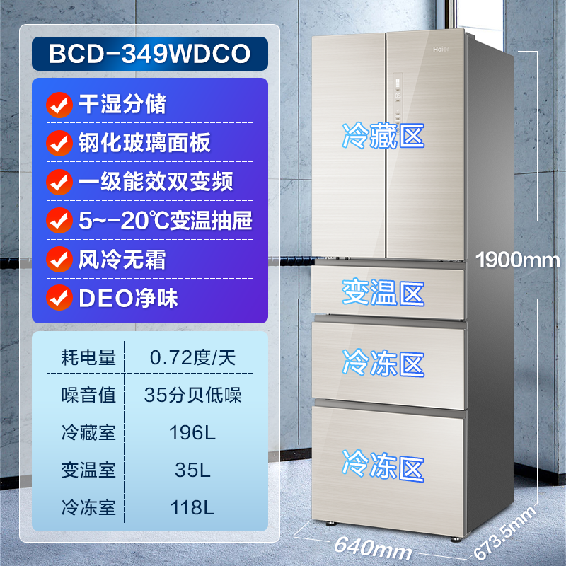 海尔(Haier)冰箱法式多门349升 风冷无霜 智能双变频一级能效家用电冰箱 【轻奢金色】BCD-349WDCO1436件已付款抢! -
