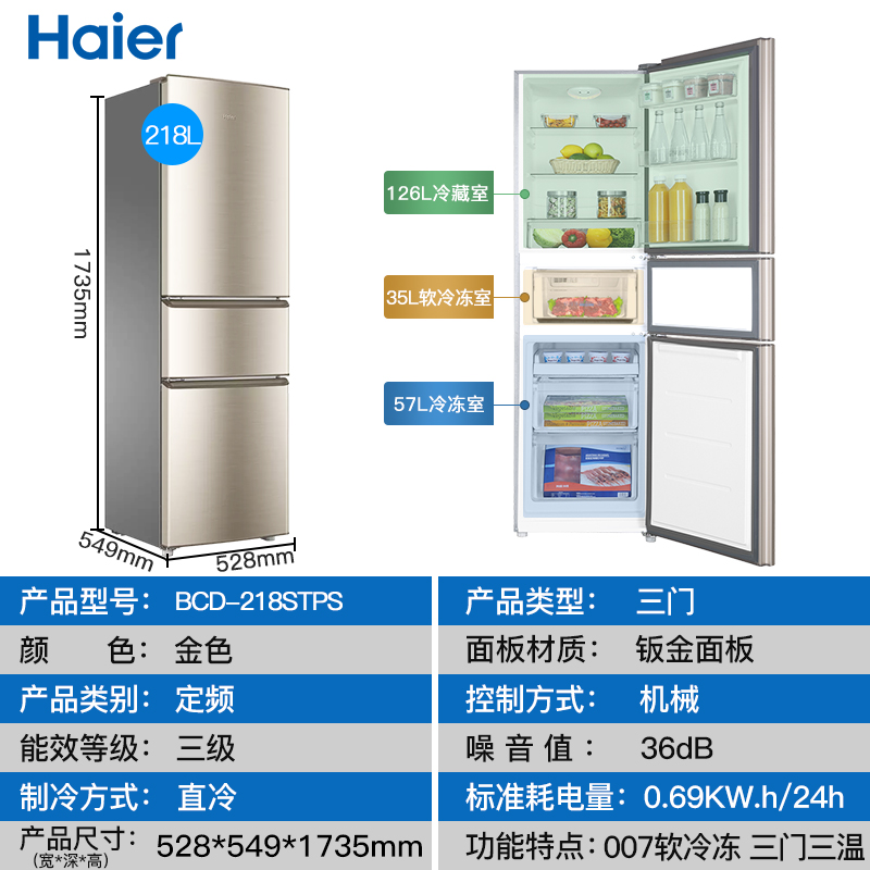Haier海尔冰箱三门超薄风冷无霜/直冷三开门小型家用迷你家电节能电冰箱 218升三开门节能直冷冰箱BCD-218STPS9558件已付款抢! -