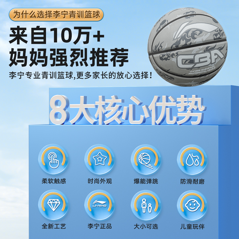 李宁(LI-NING)篮球CBA比赛儿童训练成人室内外水泥地橡胶耐磨防滑大学生青少年中小学生男女蓝球5号4318件已付款抢! -