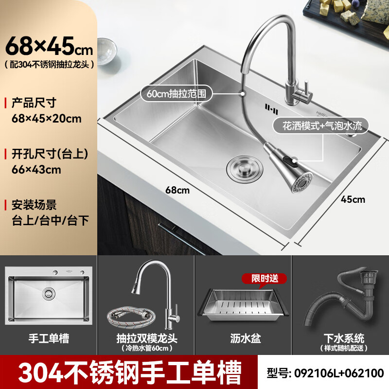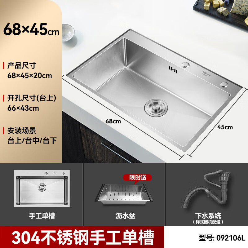 华帝(VATTI)304不锈钢手工加厚水槽洗碗池大容量单槽洗菜盆 送360°旋转抽拉厨房水龙头 092106A(680*450)5435件已付款抢! -
