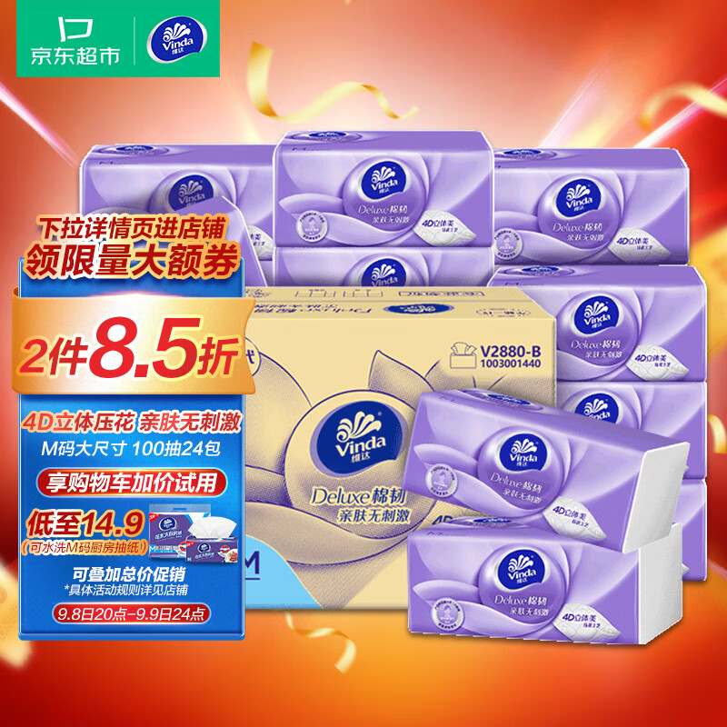 维达(Vinda)棉韧抽纸3层100抽软抽*20包M码加大尺寸 压花面巾纸餐巾纸卫生纸巾无香(整箱)7998件已付款抢! -