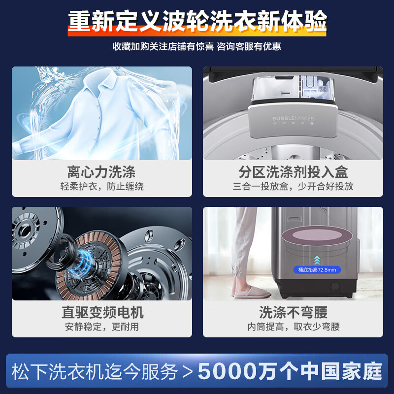 松下(Panasonic)波轮洗衣机全自动 10公斤大容量 家用租房老人 节能省水防缠绕 大件毛毯洗 XQB100-T1EKS【10公斤】7326件已付款抢! -