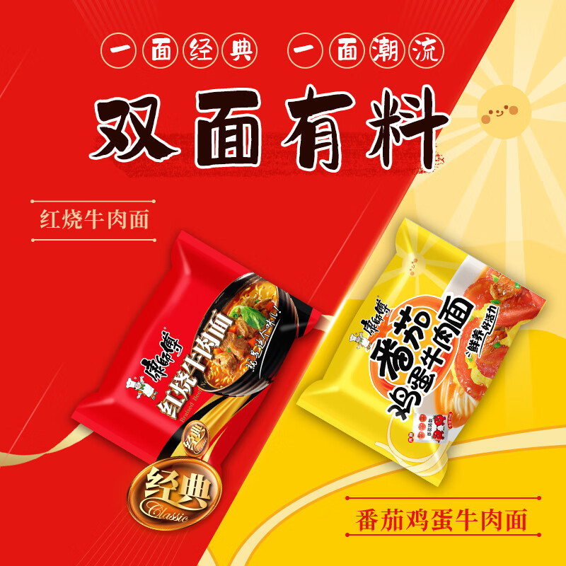 康师傅 方便面 经典红烧牛肉面*5袋+番茄鸡蛋牛肉面*1袋 泡面袋装速食 6连包组合装3956件已付款抢! -