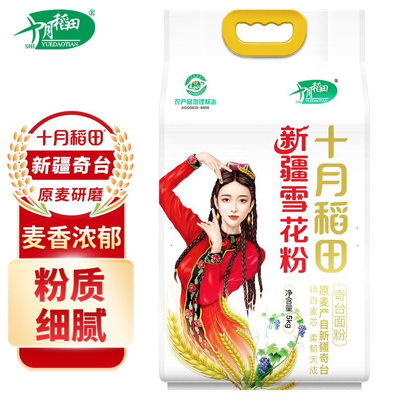 十月稻田 新疆奇台面粉5kg 雪花粉 白面 中筋小麦粉 麦芯粉 面条 饺子粉 包子馒头烙饼2826件已付款抢! -
