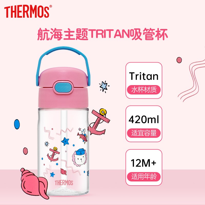 膳魔师 儿童水杯四季可用tritan材质水杯明亮撞色带杯套户外便携宝宝学饮杯航海系列吸管杯 粉蓝色420ml5345件已付款抢! -