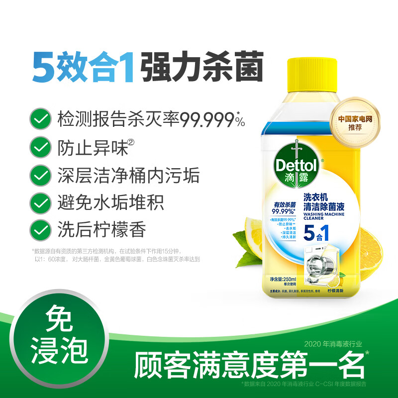 滴露Dettol 洗衣机清洗剂 除菌液柠檬清新250ml 滚筒波轮洗衣机清洁剂 有效杀菌99.9% 无需浸泡除垢去异味8675件已付款抢! -