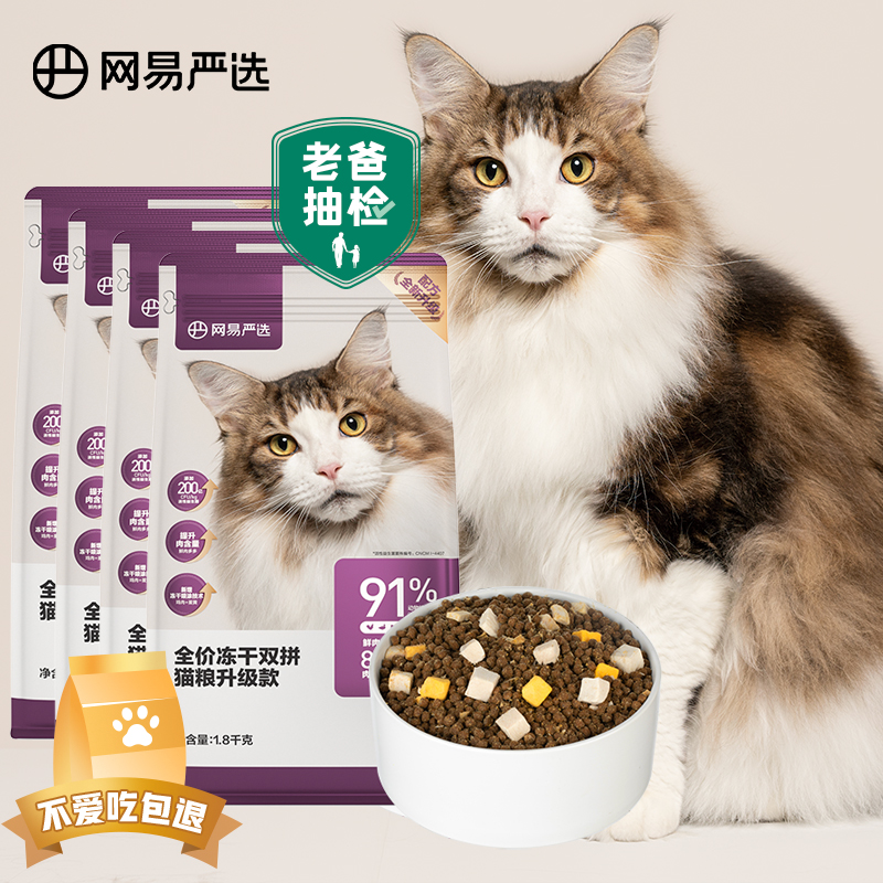 网易严选 全价冻干双拼猫粮 居家宠物主粮幼猫成猫全价天然无谷粮猫咪食品7.2kg(4袋整箱装)6379件已付款抢! -