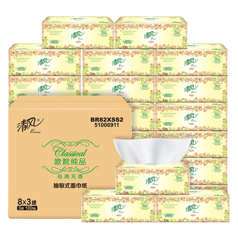 清风抽纸欧院纯品抽取式面巾纸3层100抽24包整箱实惠装 3层100抽24包(整箱)5418件已付款抢! -