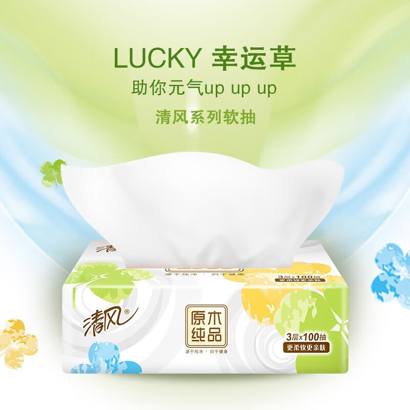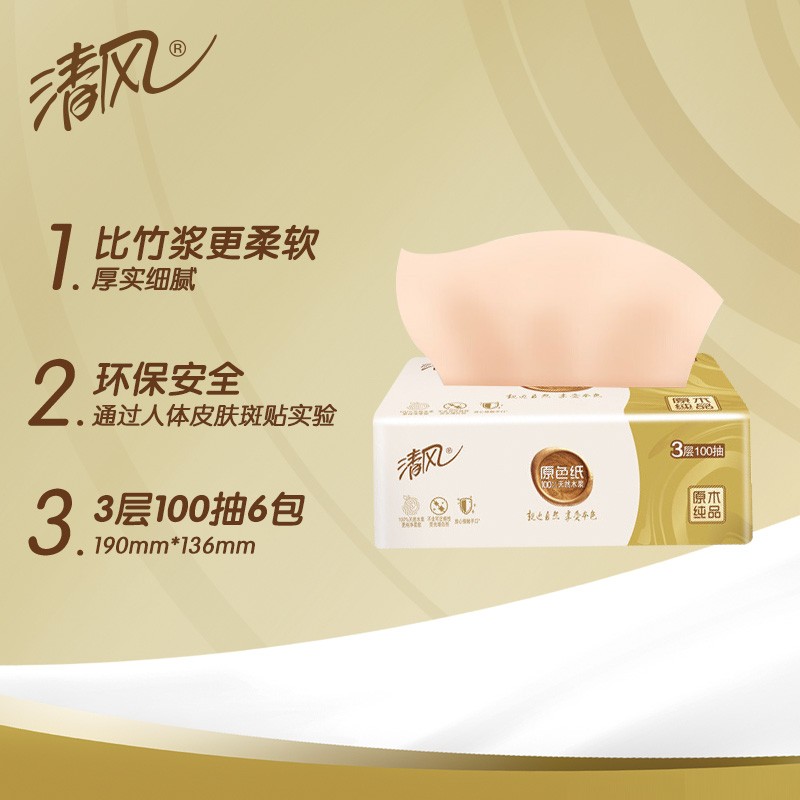 清风 本色抽纸3层100抽6包抽取式面巾纸餐巾纸原色系列家用擦手巾卫生纸纸巾8874件已付款抢! -