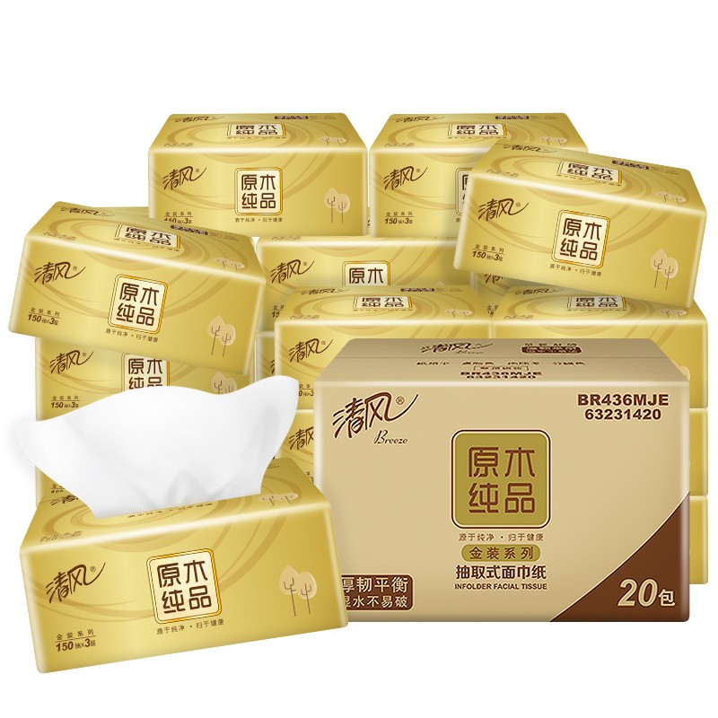 PLUS会员: Breeze 清风 原木纯品金装系列 抽纸 3层*150抽*20包(206*152mm)39.43元(需买4件,共157.72元包邮)9223件已付款抢! -