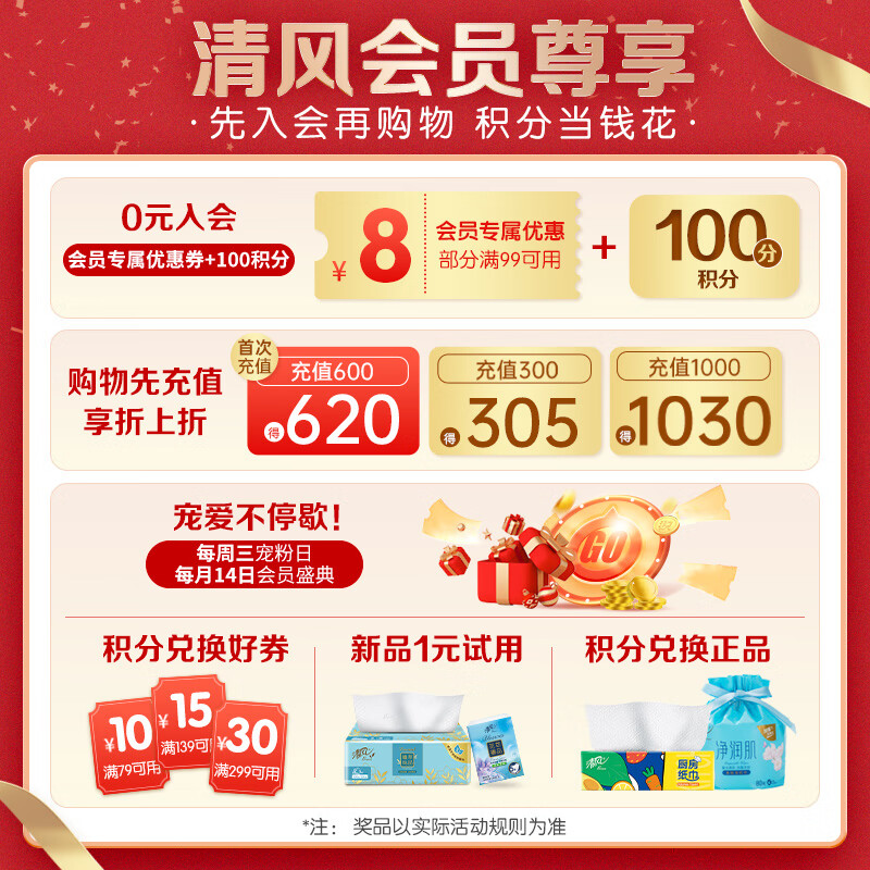 收录了89条优惠信息清风品牌隶属于金光集团全资下的金红叶纸业集团有限公司,该企业为亚洲较大的生活用纸产销公司。于1998年在中国创立,致力于生产高品质生活用纸,为千万家庭改善了生活品质。秉承着“你用纸,我种树,实践绿色大循环”的原则下,种六棵树,用一棵树,维护大自然的生态平衡。美好生活需要一颗安然的心,生活用纸亦需要安心。而能让我们觉得安心的不是承诺,是事实。清风是生活用纸行业中提出五大安心保障的品牌。在舒适度、安全度、敏感度 健康度、信任度五个层面上给你安心的理由。 它采用原生木浆,带来细腻柔软触感,湿水不易破;不含可迁移性荧光增白剂,避免添加剂附着危害,纤维纯净, 安全可靠;纯净纤维制纸,实验证明皮肤0刺激;超高温处理,菌落数远低国家标准,洁净卫生;获得消费者眼中质量代名词的企业质量ISO900认证,足够的信任凭据,让人安心之余,又安全在握。纸有清风,好安心。