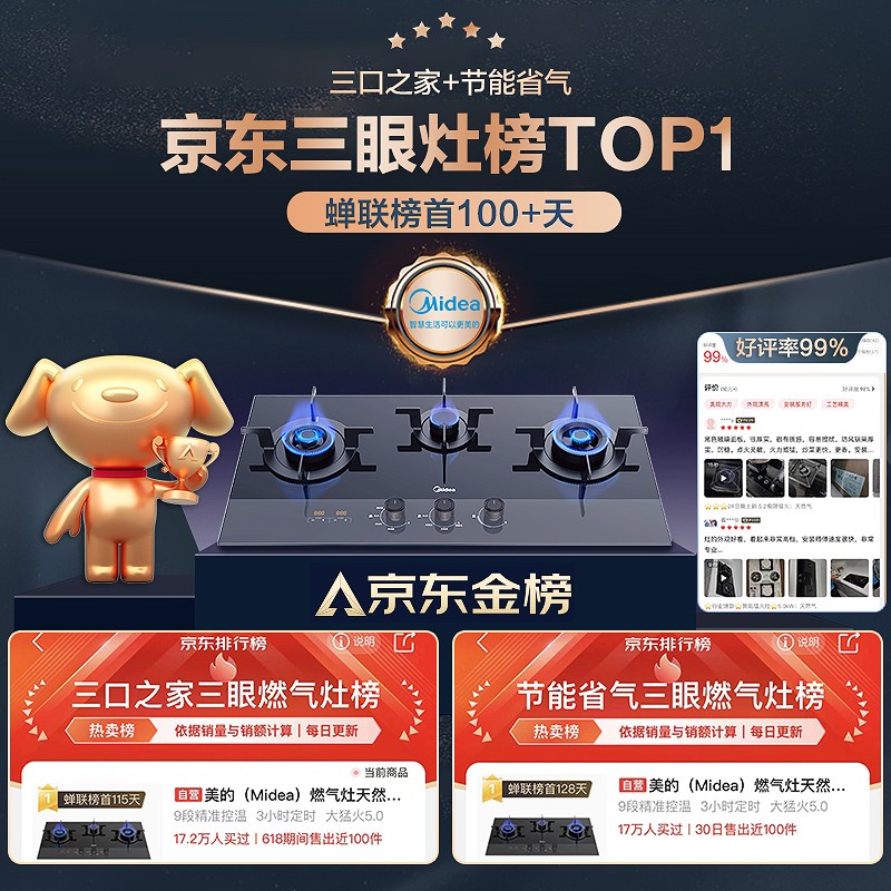 美的(Midea)燃气灶天然气 双灶具 家用三眼灶5.0kW猛火灶台嵌两用 左中双定时 易打理 以旧换新DQ31081件已付款抢! -