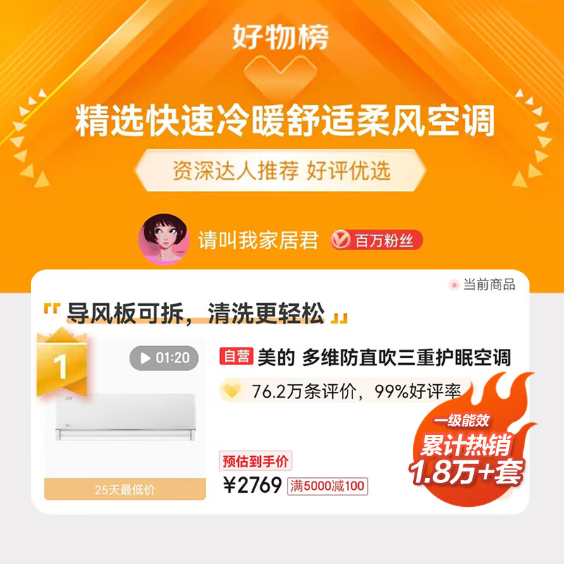 美的(Midea) 大1匹空调风尊时尚版新一级变频冷暖壁挂式空调挂机大风口以旧换新KFR-26GW/N8MXC1京东小家5847件已付款抢! -