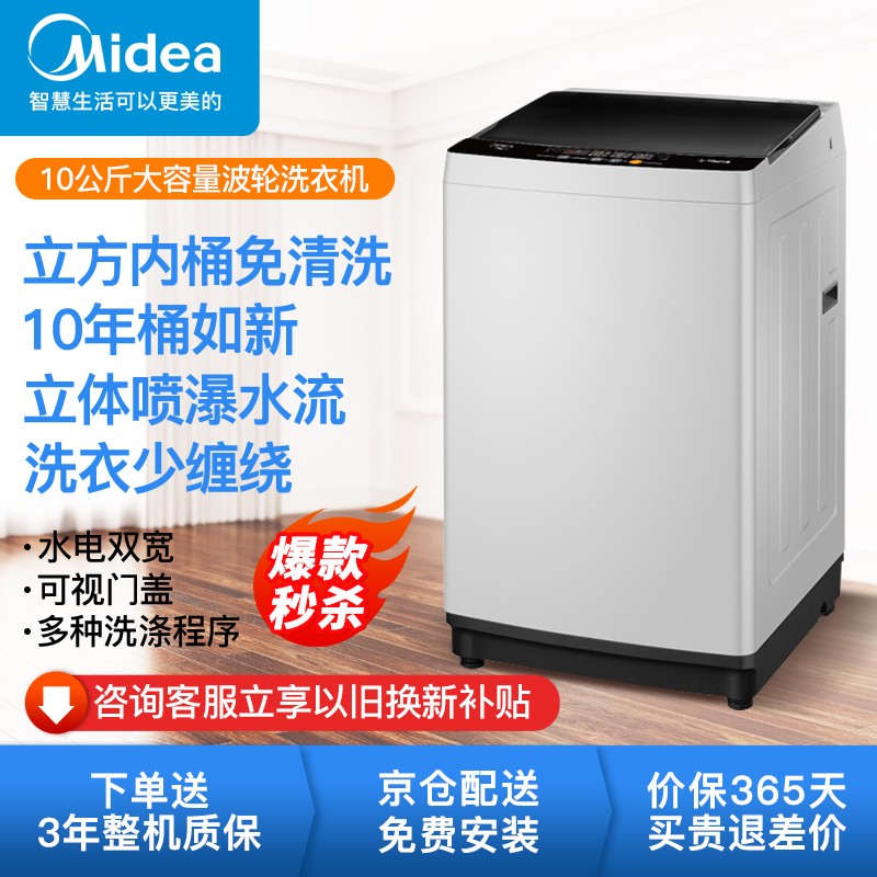 美的(Midea)10公斤全自动波轮洗衣机大容量免清洗家用租房京品洗衣机MB100ECO-H01MH 10KG免清洗波轮【经典智利灰】6957件已付款抢! -