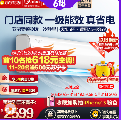 美的(Midea) 1.5匹 新一级能效变频 智能冷暖壁挂式空调冷静星KFR-35GW/BP3DN8Y-PH200(1) 【618开门红!31日晚8点付尾款到¥20满1000用203674件已付款抢! -