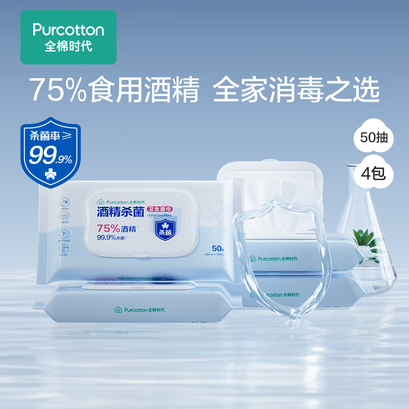 全棉时代 酒精湿巾75%酒精杀菌卫生棉片一次性消毒湿纸巾家庭外出大包实惠装15*20cm50片/袋*48644件已付款抢! -