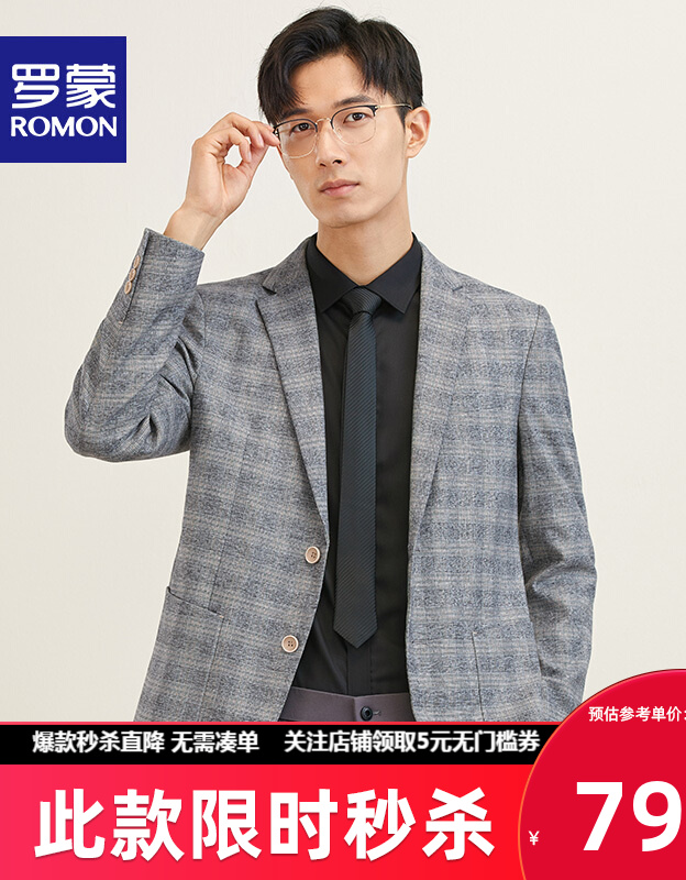【惠】罗蒙(ROMON)休闲西服男士新款商务百搭单西中青年潮流时尚西装外套男 AH4灰格 175/96B(身高175,体重150左右)9746件已付款抢! -