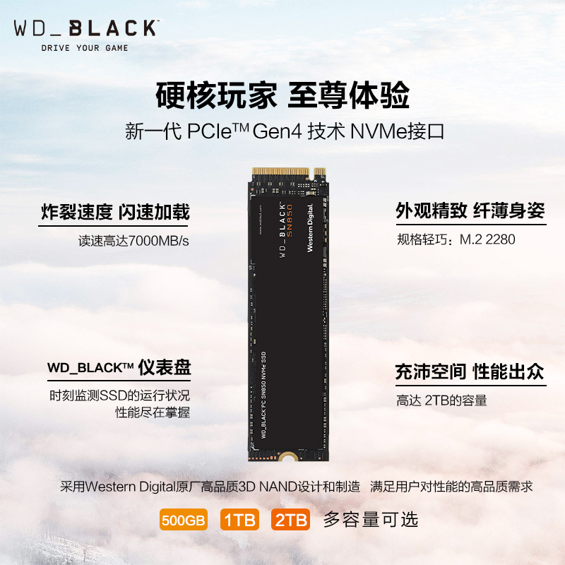 西部数据(Western Digital)1T SSD固态硬盘 M.2接口(NVMe协议) WD_BLACK SN850 PCIe Gen4 高速 大容量