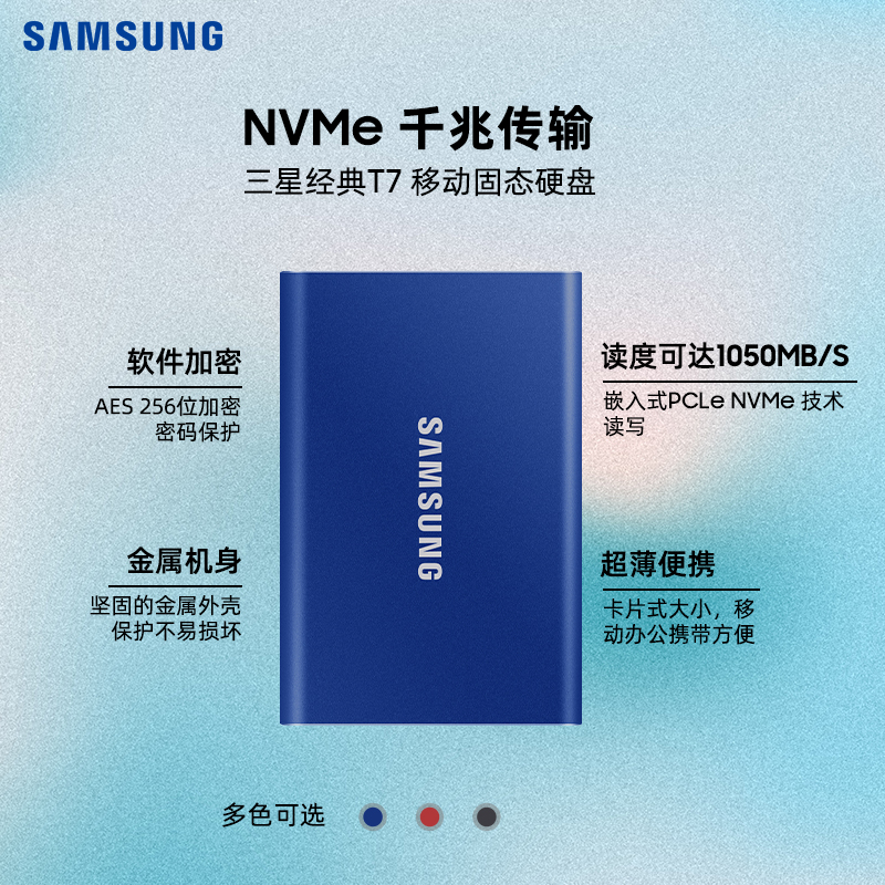 三星(SAMSUNG) 500GB Type-c USB 3.2 移动固态硬盘(PSSD) T7 蓝色 NVMe传输速度1050MB/s 超薄时尚