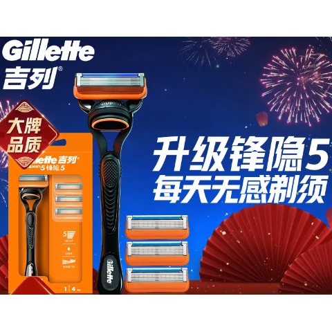 吉列剃须刀手动刮胡刀胡须刀锋隐5层刀片经典1刀架4刀头新年礼物