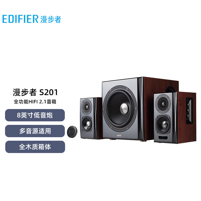 此款漫步者S201全功能HIFI有源2.1音箱,全木质箱体,自然厚重,卫星箱单元规格和箱体容积高于普通2.1音箱,配置3.5英寸铝振膜中低音扬声器+钛膜球顶高音+8英寸长冲程超低音扬声器,低频响应结实有力,具备5种输入方式,光纤、蓝牙、PC、同轴、AUX,可以轻松链接手机、平板、电脑、电视、机顶盒和游戏机等,无线遥控+侧调节更方便操控。 阅读全文